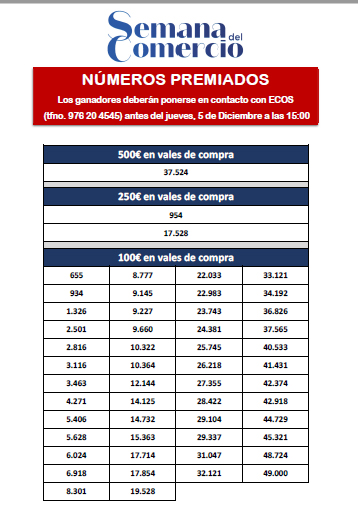 Los ganadores deberán ponerse en contacto con ECOS (Tfno. 976204545) antes del viernes, 13 de diciembre, a las 15.00 horas.